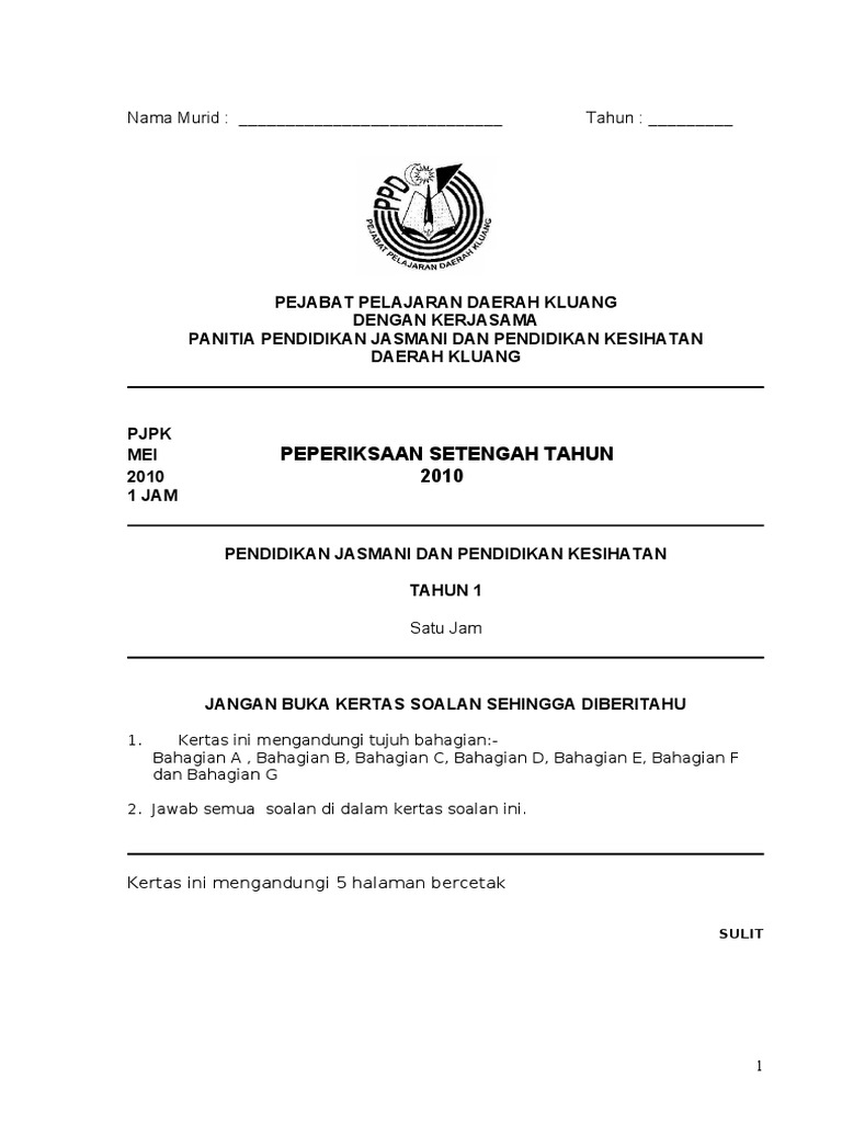 Portal ini dibangunkan untuk membantu guru-guru pelajar dan ibubapa dalam proses pengajaran dan. Kertas ujian pjk akhir tahun 2014 tahun 5 sjkt Oct. Peperiksaan Pertengahan Penggal 1 Tahun 5.